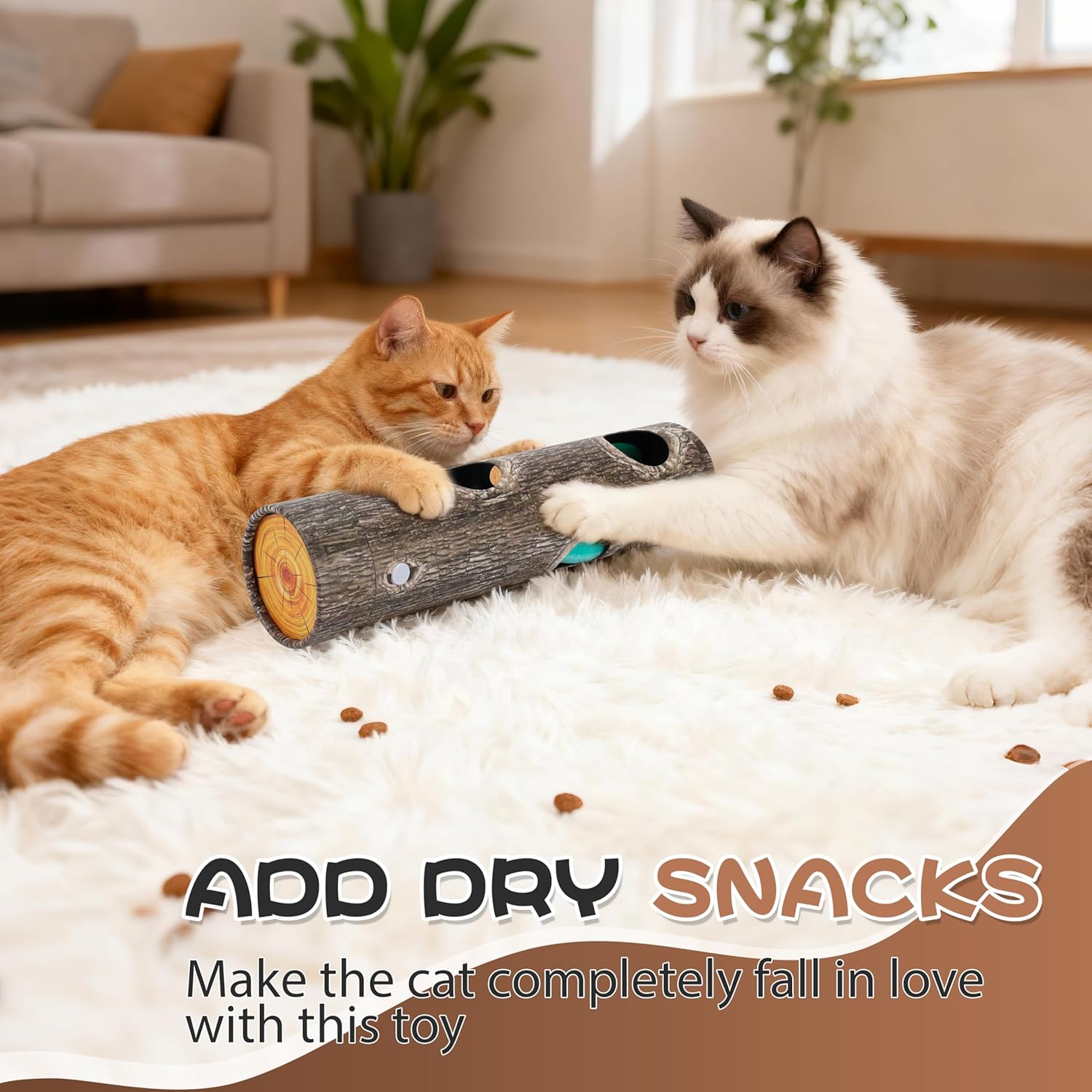 I recently introduced this tree trunk puzzle toy to my cats, and their reaction was instantaneous, they surrounded me and went crazy for it right out of the package.The toy is a rigid tube, about 11 inches long, with six holes of various sizes. It comes with two small, cute plush creature toys inside, one green, one turquoise with a bell, which immediately got their attention. My cats find the rolling action of the tube engaging, they love batting it across the floor just to hear the bell jingle and to swat at the toys visible through the holes. This rolling feature seems much more stimulating for them than their other puzzle toys that don’t move around.I did see that the tube itself is made of a smooth, rigid cardboard material, which means it slides and spins very easily on carpet.My only critique is that the larger turquoise toy is a bit too big to be easily pulled through the holes, which caused some initial frustration for one of my cats. Because she actually seemed to enjoy playing with that specific plush toy more outside of the tube.Overall, this toy is a hit. It’s a fantastic way to stimulate my cats curiosity, and the fact they play with it for long periods makes it a good value purchase in my book.