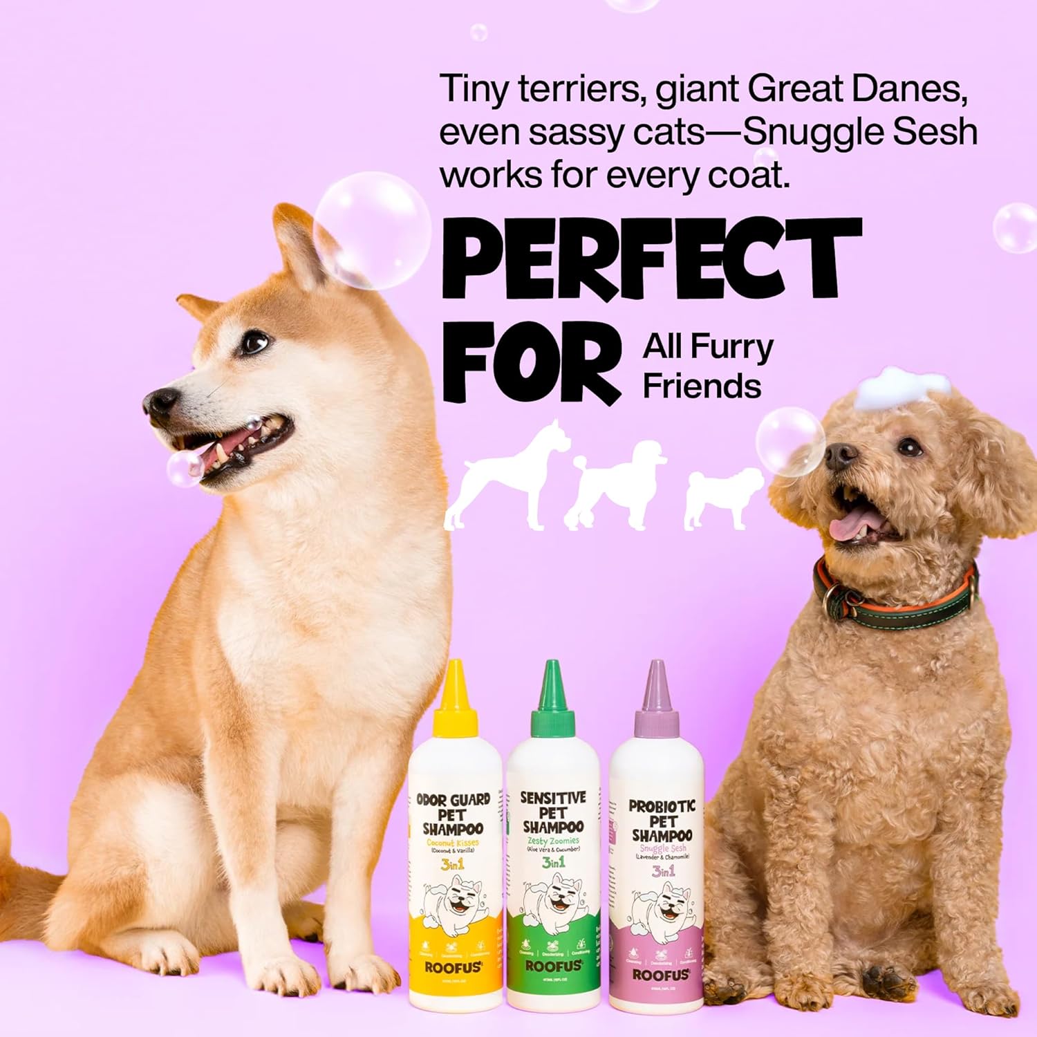 I ordered this Roofus probiotic dog shampoo, conditioner, and deodorizer in order to try a new, more natural product for my two Pekingese doggies. Mitzy (the mother) is approximately 12 years old. Izzy (the daughter) was five years old on August 1, 2025. I adopted both doggies in September 2020.Years ago, I started buying a good product at a local farmers’ supply store. It doesn’t have a strong scent, or much of a scent at all, but it is gentle and seems to work well. However, I decided to try this new pet shampoo.1. I love the lavender scent of this shampoo. It does seem somewhat strong, but it is pleasing. Plus, the scent seems to still be on my pups for a good while after the baths.I used this shampoo after it first arrived, and I liked it. It smells good and it seemed to leave their fur soft. I then switched back to my old “tried and true” shampoo for a couple of washings. Today, I returned to the Roofus shampoo.2. I really appreciate the natural ingredients in this shampoo—-lavender (I actually grow some of that in my flower beds); chamomile; coconut oils; aloe; cucumber; and probiotics. Those ingredients should be good for my dogs’ skin. According to the product description, this shampoo is safe to use weekly.3. This shampoo is ph balanced, hypoallergenic, and provides relief for itchy skin. My dogs’ skin looked good today when I bathed them, but relief for itchy skin is always a good thing. Sometimes smaller dogs develop skin allergies to things like grass.4. This shampoo does seem to lather well. It is thicker and creamy in texture, and when you add water, you get a great lather. I try to keep the lather going for about 10 minutes on each dog. I apply the shampoo rather liberally, but I think that I could likely use less shampoo and still have a very clean dog.Overall, I really like this shampoo for the lavender scent, the natural ingredients, and the way that it leaves my dogs’ fur soft to the touch. I plan to purchase more of this shampoo when I need to reorder. Please see my photos showing the shampoo bottle and two cute, clean pups!UPDATE: one day after their baths, I can really see and feel a huge difference in Mitzy’s fur. It feels softer to the touch and Mitzy shed much less after her bath. Usually, I joke that I have enough fur to be able to build a new dog. This after-bath brushing yielded only one brush full of hair. I was well-pleased with these results! It was also much easier to brush Mitzy. I plan to continue purchasing this shampoo and conditioner for both my girls. Great product and definitely recommend!Please see my photo of Mitszy’s back and head while she is sitting beside me. Pekingese have a double coat of fur which makes it more challenging to shampoo and dry.