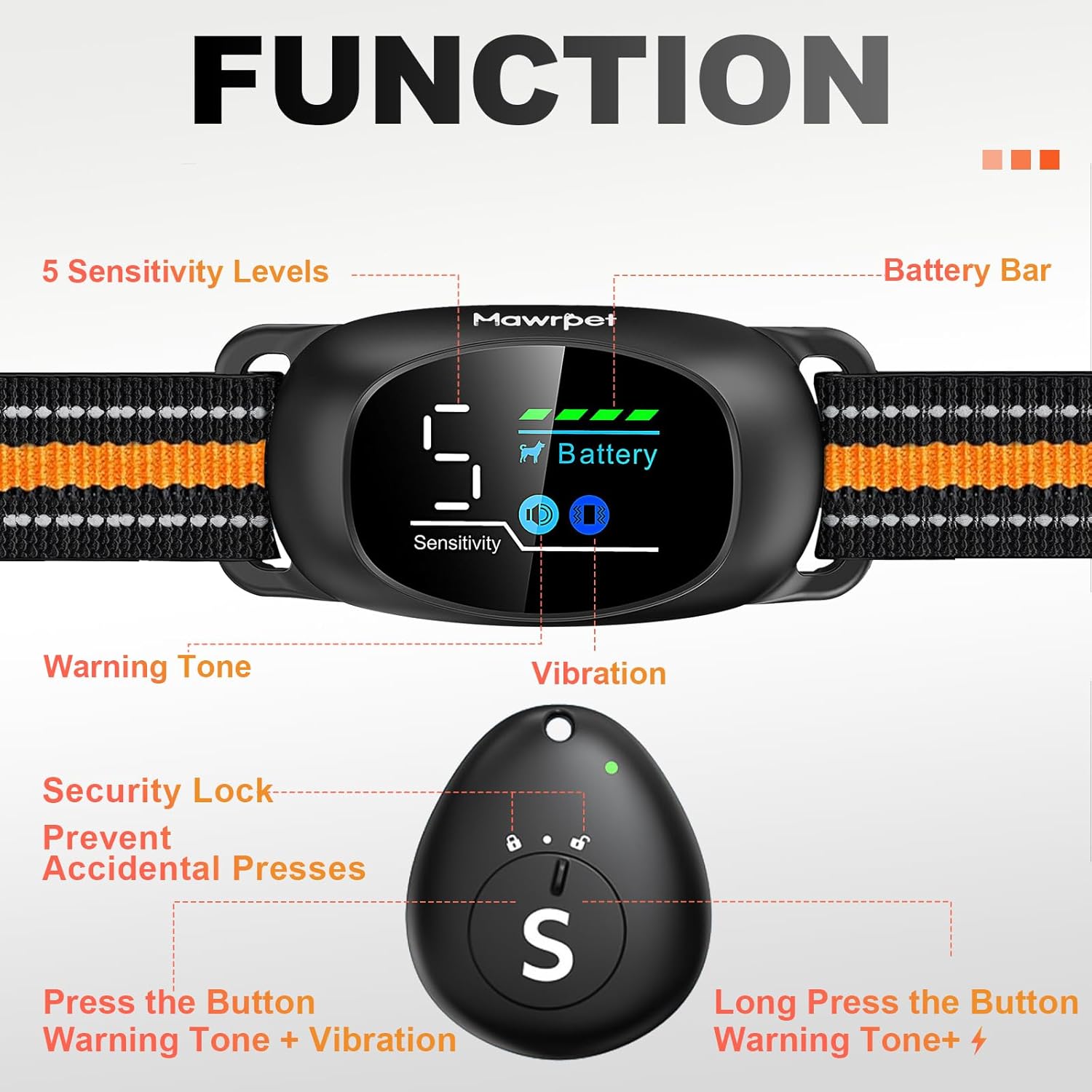 【4 Automatic Anti-bark Modes and 2 One-Click Remote Control Training Modes】 Mawrpet anti-bark collar with remote tag is a 2-in-1 anti-bark and training collar. It can automatically detect barking sounds to trigger alert sounds, vibrations, and other functions on the collar. It also allows you to immediately stop barking or train your dog through a remote tag.The automatic anti barking feature has 4 modes (which can be selected on the collar), and manual remote training has 2 modes (selected by pressing the button briefly or by long pressing for 1.5s)